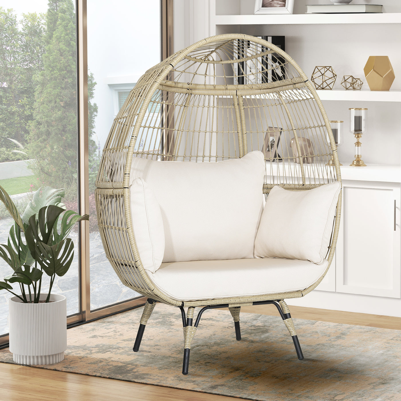 Colour of Rattan: Light Brown Colour of Cushion: Off White Material: PE Rattan, Metal, Polyester, Sponge, Spray-bonded, Non-woven, Fabric Overall Dimension: 110 x 82 x 145 cm (L x W x H) Dimension of Back Cushion: 88 x 61 x 26 cm (L x W x Thickness) Dimension of Seat Cushion: 93 x 73 x 12 cm (L x W x Thickness) Dimension of Each Small Cushion: 58 x 41 x 19 cm (L x W x Thickness) Seat Height from the Ground: 32 cm Net Weight: 22 kg Weight Capacity: 180 kg Box Qty:2(May vary by batch)Package Includes: 1 x Egg Chair 1 x Back Cushion 1 x Seat Cushion 2 x Small Cushions 1 x Instruction Manual