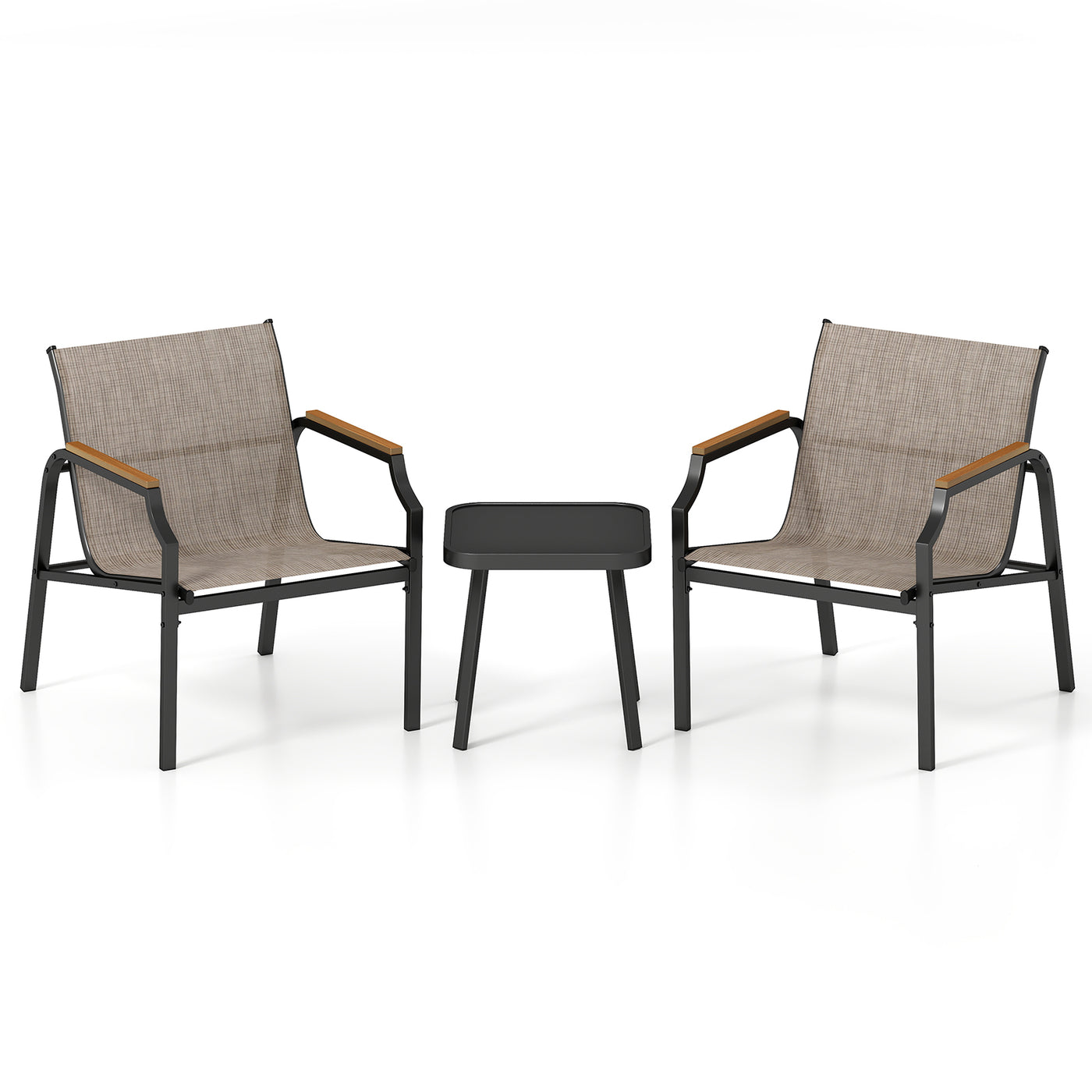 Constructed with premium metal pipes, the set ensures long-lasting stability and support. The chairs include widened 54 cm seats with ergonomic contours and wood-plastic armrests for enhanced comfort. Moreover, the sleek square coffee table boasts a tempered glass top, which is perfect to hold drinks and snacks. Suited for y balcony, porch, or garden, this bistro set with exquisite details promises to transform your outdoor area into a heaven for relaxation and engaging conversations. Robust Metal Build: Crafted with heavy-duty metal pipes and firm screw connection, the whole patio furniture set will offer ultra-strong support and long-lasting seating solution. Moreover, each chair features support cross rods at the back for higher stability. Comfy Seat Fabric: The seating surface of this outdoor set is made from rip-resistant, anti-fading fabric that’s also quick-drying and breathable, withstanding long-time outdoor use. Note: Please avoid rain exposure for prolonged service life. Ergonomic Armchairs: Each armchair of the bistro set offers enhanced comfort with 54 cm widened seat. The wood-plastic armrests and contoured seat and backrest contribute to an upgraded comfortable experience. Stylish Side Table: This patio chair set comes with a chic square coffee table with a sleek black tempered glass top that’s aesthetically pleasing and easy to clean. The round corners add safety to the modern design. Fabulous Relaxing Option: Perfectly suited for settings such as balcony, porch, or garden, this 3-piece chair set brings contemporary flair and comfort, making it fantastic for relaxation and conversation. Dimension of chair: 70 x 61 x 76 cm (L x W x H). Dimension of coffee table: 44 x 44 x 42 cm (L x W x H).