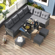 7 Pieces Patio Dining Furniture Set Outdoor PE Rattan Sectional Sofa Set-Grey