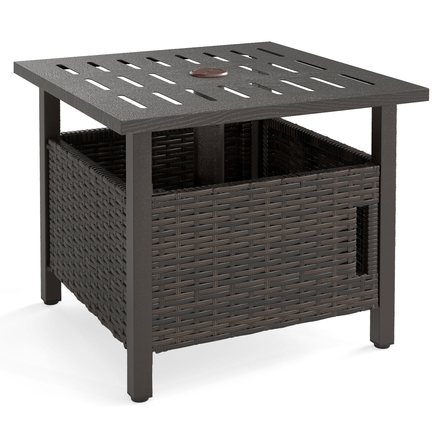 This sturdy patio side table is built with a rustproof zinc-iron alloy and galvanized iron frame, capable of supporting up to 120kg. It features a 4.9cm umbrella hole with an adjustable screw for your poles, ensuring shade and protection perfectly blend into your setup. For added stability, this outside umbrella table includes 2 weighted sand bags, each holding up to 5kg of sand, seamlessly stored via an accessible front door. The inner space also allows you to store items conveniently. Additionally, Adjustable foot pads maintain balance, making this the quintessential addition to your porch, garden, deck, or poolside. Note: The patio umbrella and sand are not included. All-Weather Durability: This patio side table is hand-woven with premium PE rattan, making it all-weather, sun-protective and fade-resistant. Whether it’s under the sun or in the occasional rain, it can withstand the elements without losing its charm. Umbrella Accommodation: Equipped with a 4.9cm built-in umbrella hole, this wicker side table seamlessly supports your sunshade (not included). It includes an adjustable fixing screw to securely fit your umbrella poles. 2 Weighted Sand Bags: This outdoor side table includes 2 weighted sand bags (each capable of holding up to 5kg of sand). Simply place these bags inside via the easy-access front door for increased stability. Plus, the inner space also facilitates convenient storage. Rustproof & Reliable Construction: This outside umbrella table is built from a robust blend of zinc-iron alloy and galvanized iron, offering rustproof durability and reliable support with a maximum load capacity of 120kg. Perfect Versatility: At 48cm in height, this outdoor coffee table fits your patio chairs or recliner perfectly. Plus, the adjustable foot pads ensure that it remain balanced on your garden, deck or poolside.