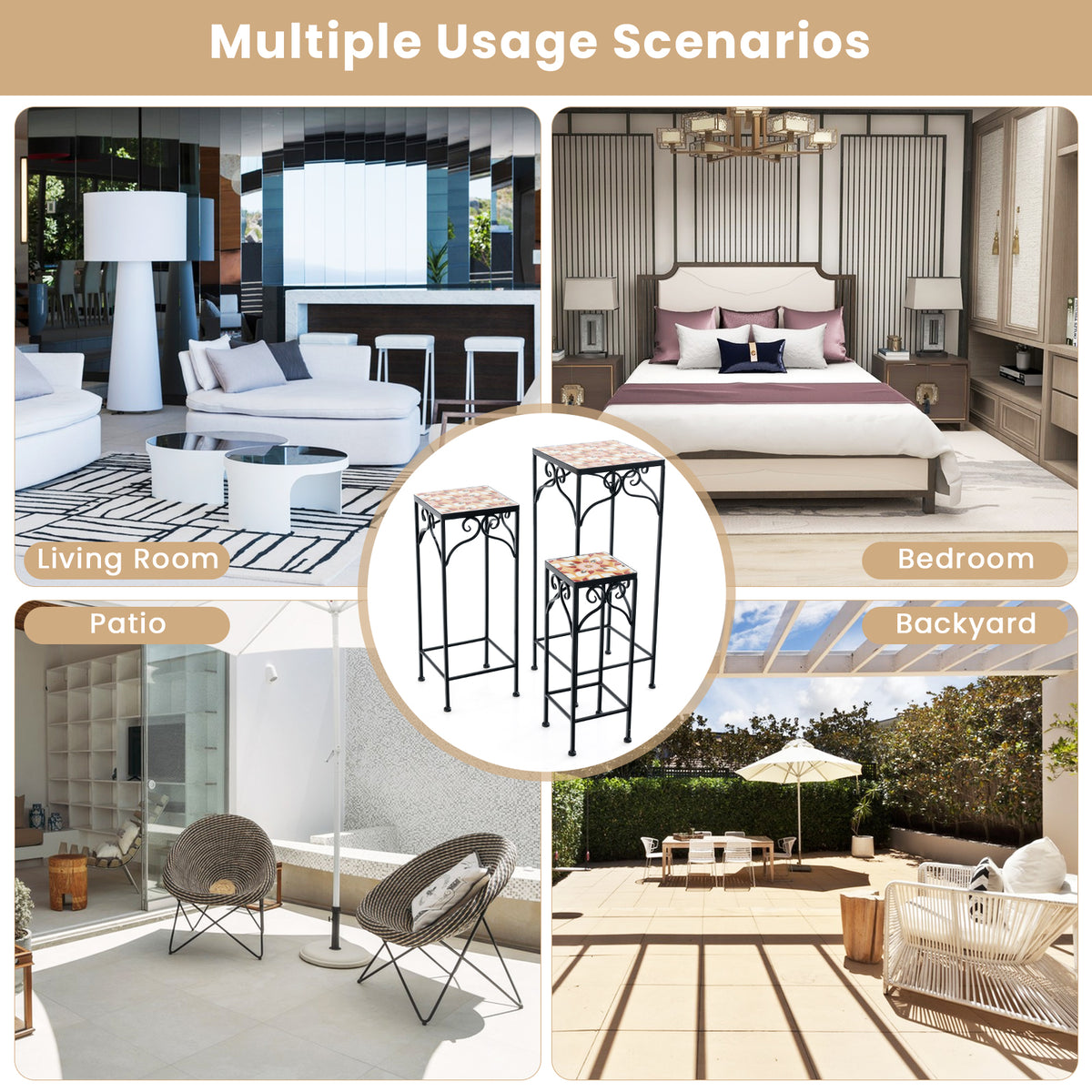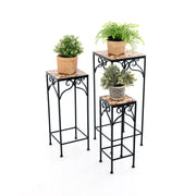 Crafted with a reliable metal frame, each flowerpot stand is resistant to rust and adorned with a mesmerizing mosaic top that will capture your attention. Worried about stability? Fear not! Each plant holder comes with anti-slip foot pads, ensuring a secure placement while protecting your precious flooring from scratches. With 3 different sizes, you can mix and match these enchanting plant stands to create a charming plant corner that suits your space, whether it's in your home, on your balcony, or on your patio. If you are looking for a plant stand set like this, do not hesitate to place an order! Ideal Storage Solution: For better indoor decorating, the plant stand set contains 3 flowerpot holders to store lovely flowers. Also, they can be used as side end tables to display your precious collections. Reliable Metal Frame: Each plant display rack is built with metal tubes to gain higher strength, while being painted to resist rust. Plus, anti-slip foot pads are included to increase overall stability and protect the floor from being scratched. Elegant Appearance: With 4-sided scrollwork patterns, the plant pot holder set looks elegant and noble. Besides, each flowerpot holder features a mosaic top, making itself stand out from normal planter stands and successfully capturing your attention. Versatile Applications: Since plant stands come in 3 sizes (big/medium/small), you can choose the right flower pot holder for different spaces, like home, balcony, patio, etc. Or, they can be combined to create a charming plant corner. No Assembly and Nesting Design: Surprisingly, each plant stand needs no installation, which means you can use them as soon as you receive the package. Also, when not in use, they can be fully nested to simplify storage and save space.