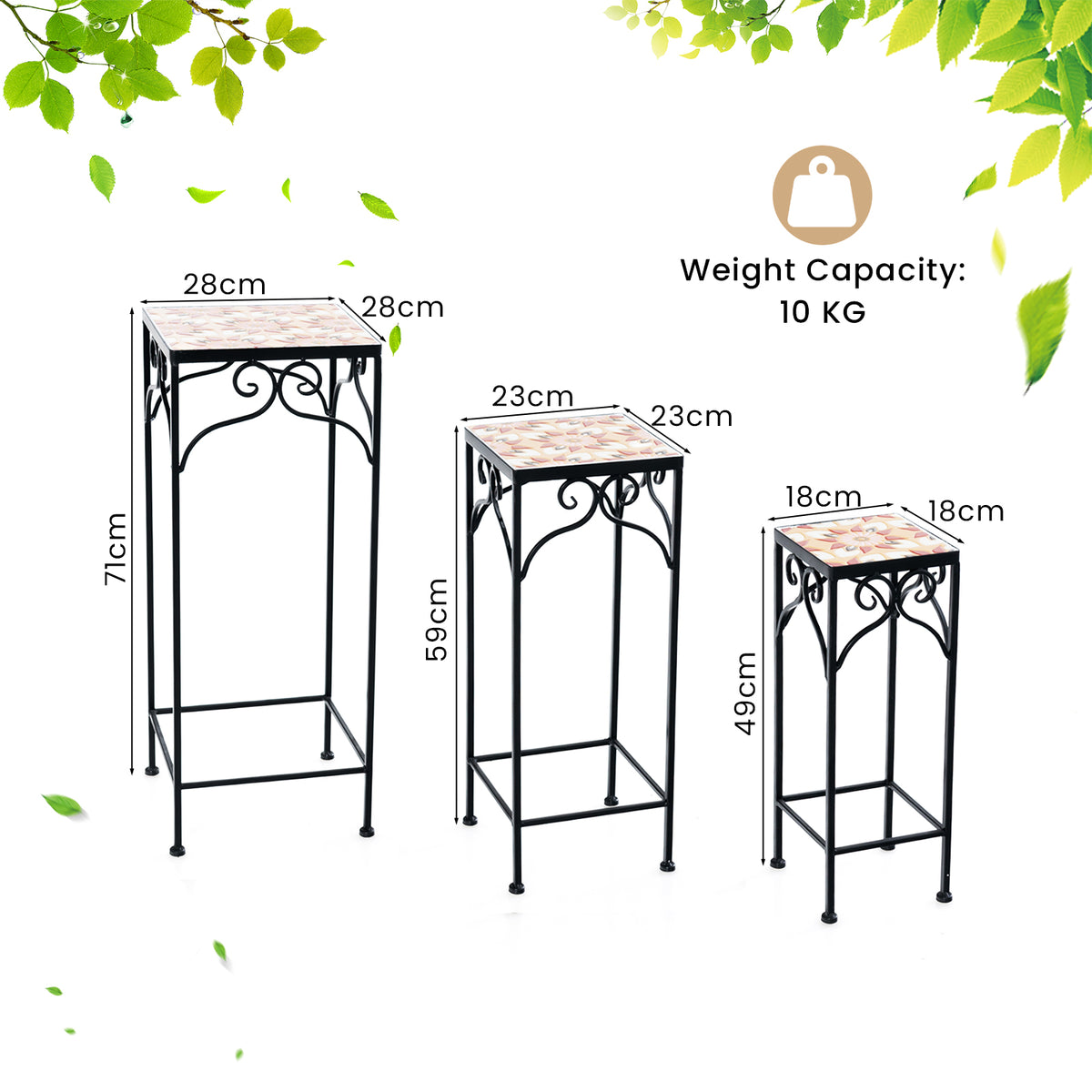 Color: Blue/Yellow Material: Metal, Mosaic Tile Size of Big Plant Stand: 28 x 28 x 71 cm (L x W x H) Size of Medium Plant Stand: 23 x 23 x 59 cm (L x W x H) Size of Small Plant Stand: 18 x 18 x 49 cm (L x W x H) Load Capacity of Each Plant Stand: 10 kg Net Weight: 10 kg Box Qty:1(May vary by batch)Package Includes: 1 x Big Plant Stand 1 x Medium Plant Stand 1 x Small Plant Stand