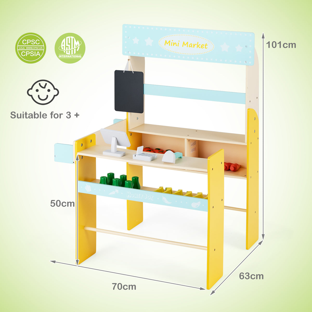 Colour: Blue + Yellow + Natural Material: MDF + Solid Wood Overall Dimension: 70 cm x 63 cm x 101 cm (L x W x H) Countertop Height: 50 cm Applicable Age: 3 + Net Weight: 10 kg Box Qty:1(May vary by batch)Package includes: 1 x Pretend Grocery Store 6 x Tomato 6 x Banana 6 x Carrot 6 x Green Pepper 6 x Eggplant 6 x Pear 1 x POS Machine 1 x Scanner 1 x Cash Register 1 x Instruction Manual