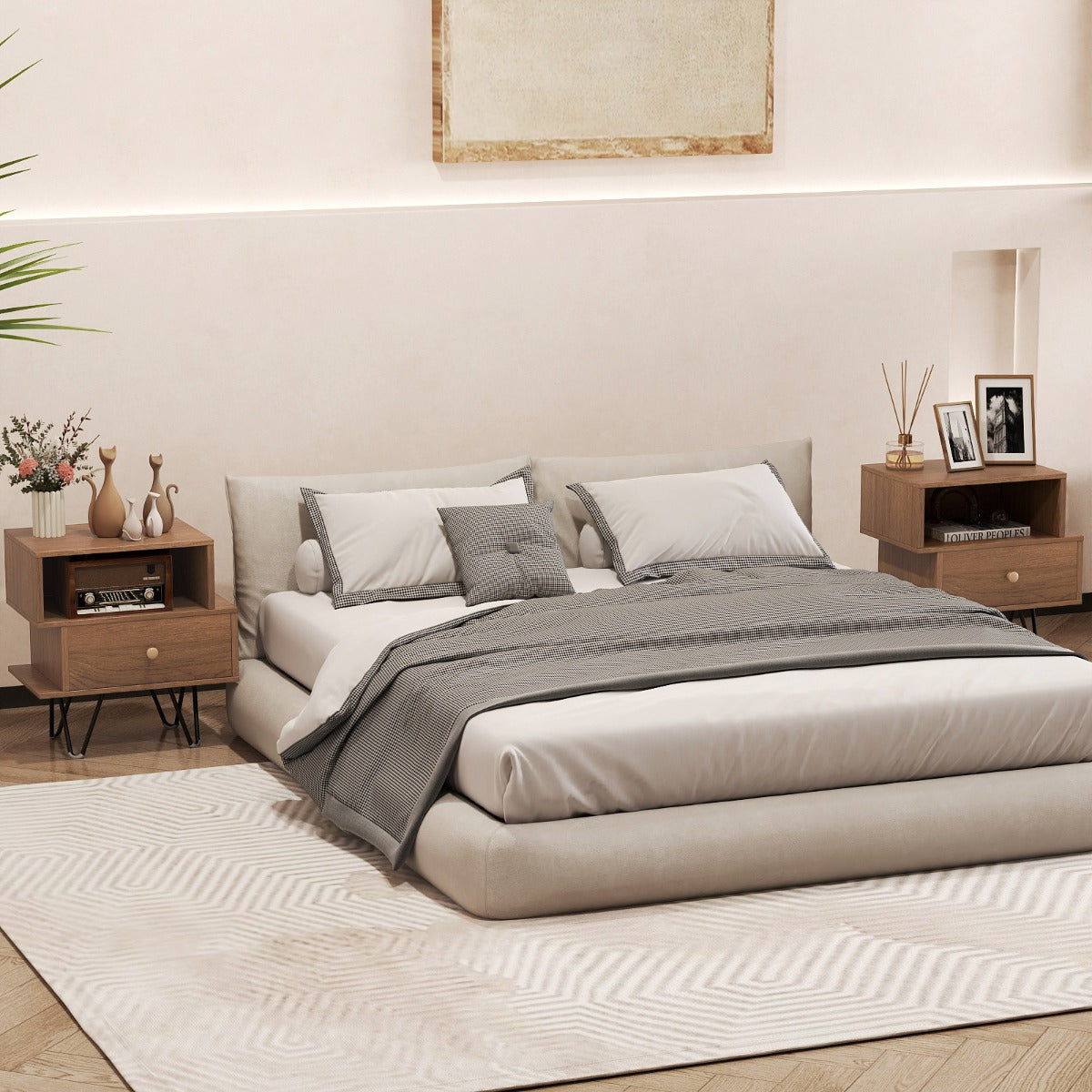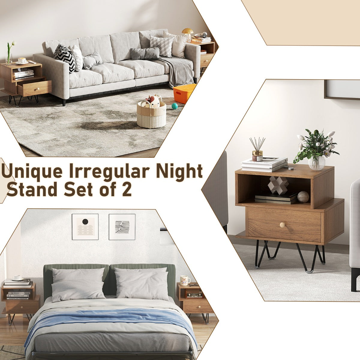 Mid Century Modern End Tables Set of 2 with Removable Drawer-Natural