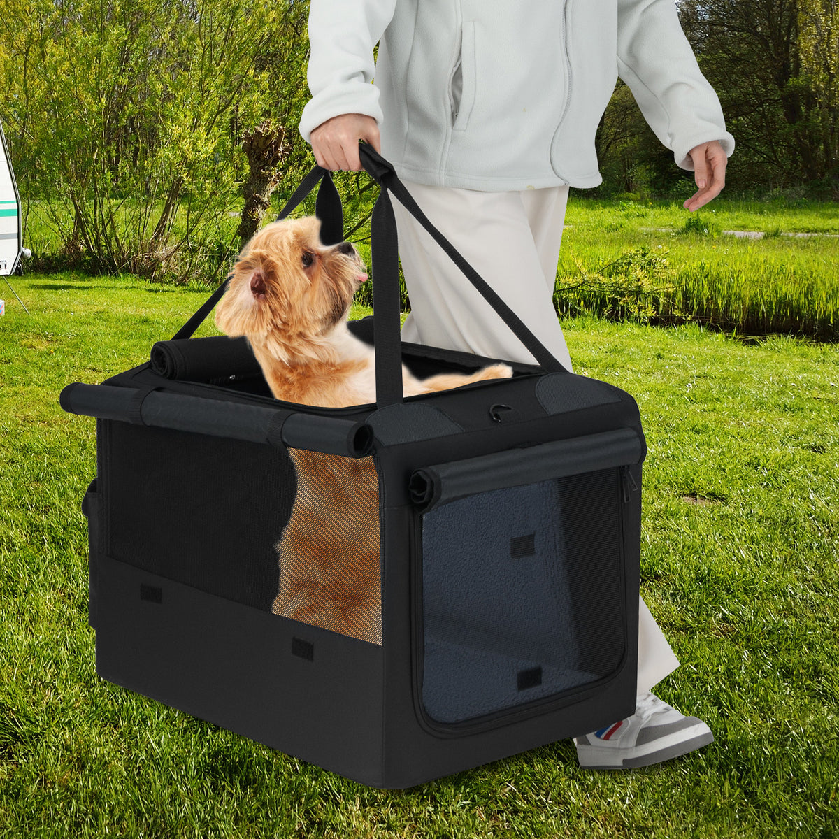 This versatile pet carrier combines functionality and comfort, featuring multiple openings and mesh windows for enhanced visibility and easy access to your pet. It includes a extandable mesh basket to keep your pet secure and comfortable. The foldable and portable design allows for compact storage, making it ideal for travel, camping, or everyday use. It can be easily carried as a handbag or backpack, thanks to its detachable shoulder straps. Suitable for both indoor and outdoor activities, this carrier is crafted from 600D Oxford fabric and supported by a sturdy metal frame, ensuring long-lasting durability. Additionally, it also includes a soft cushion for added comfort, along with practical side pockets and a water cup holder for storing essentials. Multiple Openings and Included Basket: This doge crate features 2 convenient openings for easy access to your pet, and a mesh window for better visibility. Besides, it also comes with a built-in extandable mesh basket with mat that serves to limit your pet's movement, ensuring they stay secure and comfortable. Foldable and Portable Design: Designed with a foldable structure, this pet carrying bag allows for compact storage when not in use. The lightweight design makes it perfect for travel, camping, or simply moving around the house. This bag can be used as a handbag or backpack, with detachable shoulder straps for added convenience. Wide Application: This collapsible travel dog crate is suitable for both indoor and outdoor activities. Whether you're going on a weekend getaway or just need a cozy space for your pet at home, this pet carrier is a reliable and practical choice. Selected Material and Stable Frame: Crafted from high-quality 600D Oxford fabric, this pet carrier is both reliable and easy to clean. Additionally, the sturdy metal frame is designed to withstand daily use and ensure long-lasting durability. More Practical Designs: This portable dog kennel includes a soft and comfortable cushion for added comfort and space. Moreover, the 2 convenient side pockets and a water cup holder for storing essentials.