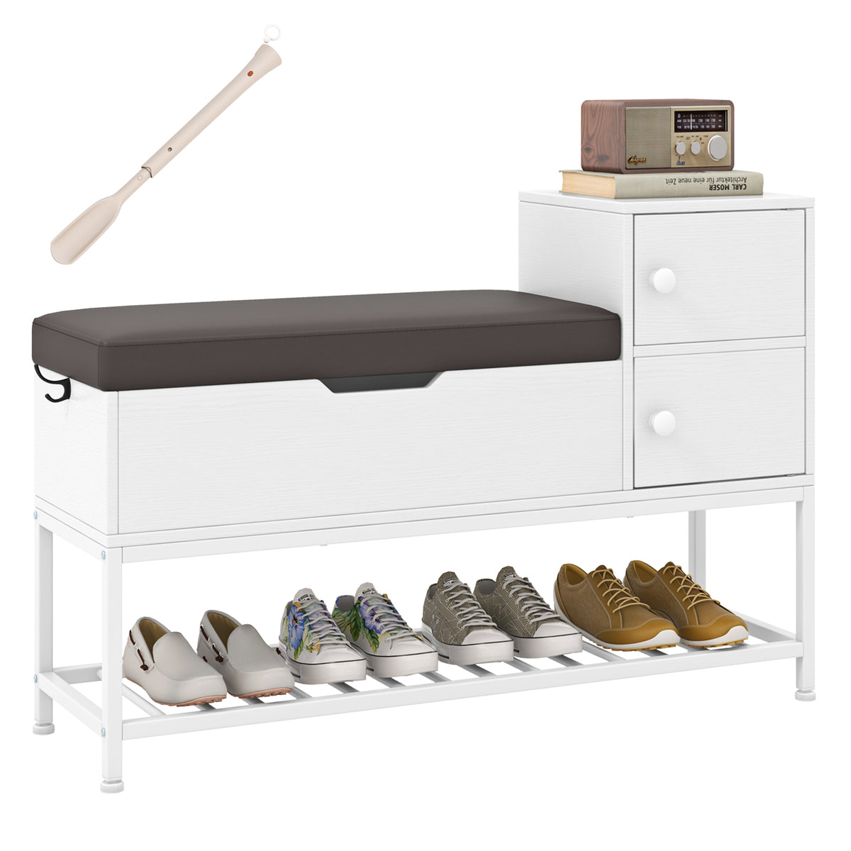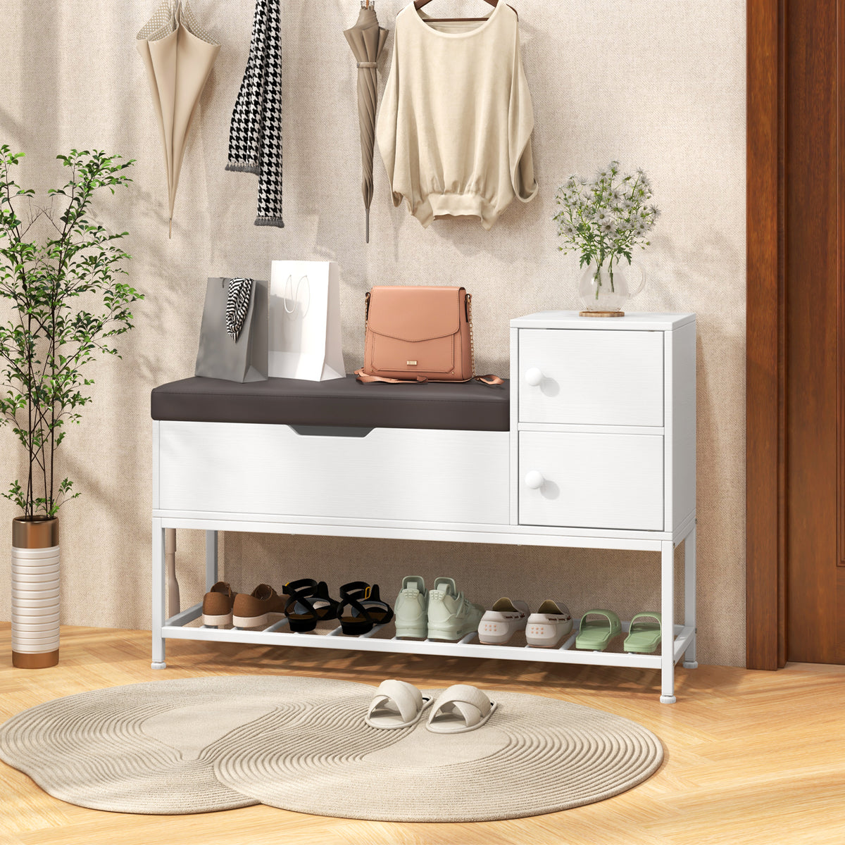 Say goodbye to clutter with 1 flip top storage chest, 1 metal shoe rack, and 2 door cabinets. The cut-out...