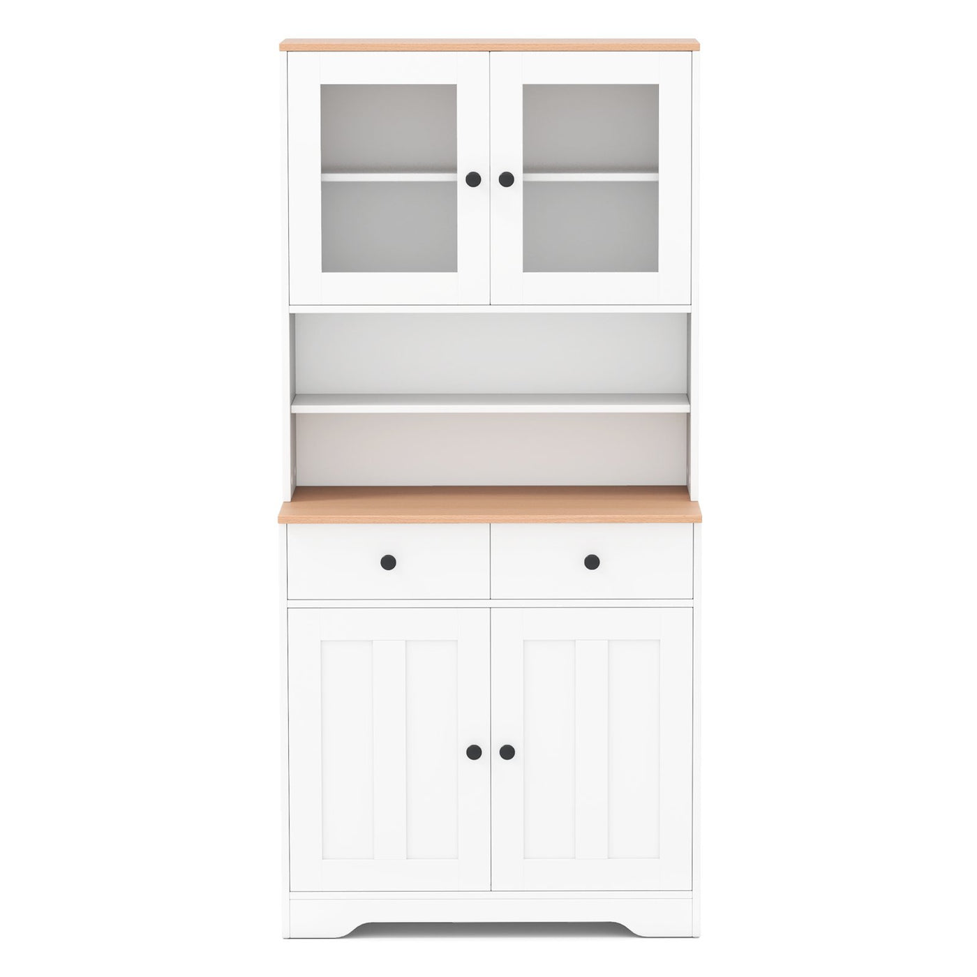 Adorned with 2-door cabinets, it stores various objects and keep them easily accessible. Furthermore, you can customize your storage space with 3 adjustable shelves, ensuring a snug fit and organized look. The addition of 2 drawers and hutch provide ample space to organize essentials. The tall pantry is thoughtfully designed with non-slip pads, promising stability and floor protection. This all-in-one solution is not only perfect for your kitchen but versatile enough for various rooms, from living rooms to bedrooms, bringing order and sophistication to your space. Multiple Storage Options: Featuring a transparent door cabinet, 2 open shelves, 2 easy-to-pull drawers, and a spacious bottom cabinet, the tall pantry maximizes your kitchen's storage potential. Plus, it allows you to conveniently store and display items. Customizable Organization: Tailor your storage with 3 detachable shelves in the hutch and upper and bottom cabinets, ideal for accommodating items of varying sizes. Whether storing foods, tableware or small appliances, adjust the shelving to create your perfect storage solution. Sturdy and Stable Construction: Crafted from premiums materials, the freestanding cupboard is designed for durability and long-lasting use. Besides, the non-slip foot pads ensure stability and protect your floors from scratches, making it a reliable addition to your kitchen furniture. Enhanced Functionality: The door stoppers prevent accidental slamming, while the smooth slide rails ensure the drawers operate effortlessly. Moreover, the buffet sideboard comes with sleek handles to offer a user-friendly experience. Adaptable for Various Rooms: Not just for kitchens, this versatile storage cabinet is perfect for living rooms, dining rooms, bedrooms, etc. It works well as a bar cabinet, coffee station and more, adding a touch of elegance wherever placed.