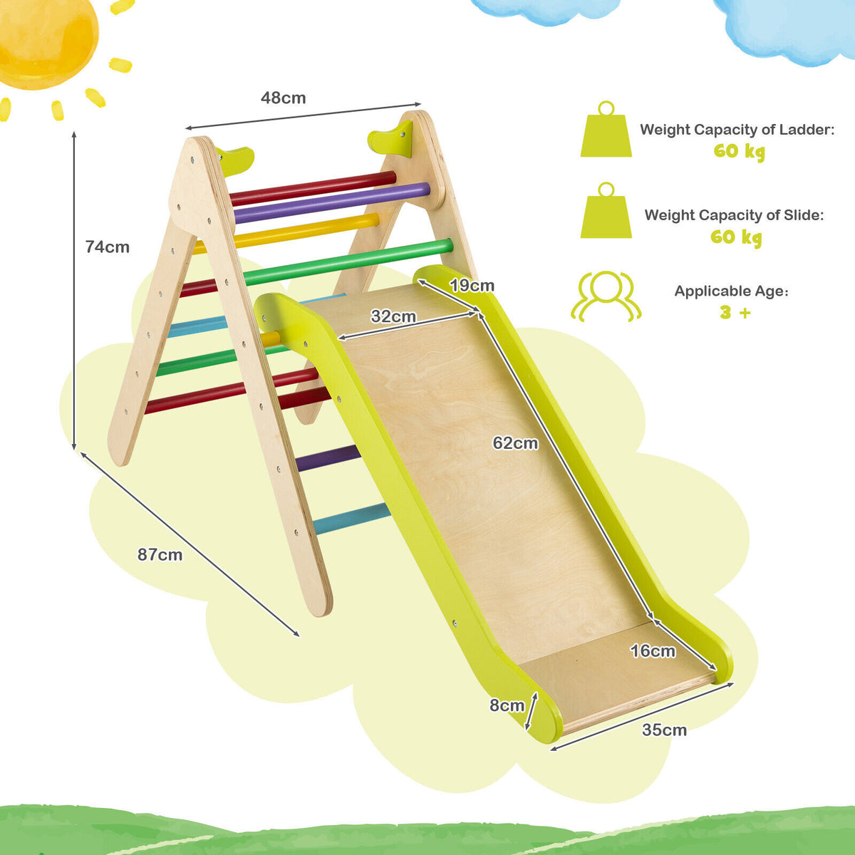 Colour: Multicolor Material: Beech wood, birch plywood Dimension of triangle climber: 87 cm x 74 cm x 48 cm (L x W x H) Dimension of slide: 97 cm x 35 cm x 26 cm (L x W x H) Load capacity of triangle climber: 60 kg Load capacity of Slide: 60 kg Suitable age: 3 + Net weight: 8 kg Box Qty:1(May vary by batch)Package includes: 1 x Triangle climber 1 x Slide 1 x Instruction manual