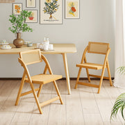 Designed for versatile use in your dining room, kitchen, living room or bedroom, these bamboo dining chairs feature a robust triangular structure and anti-slip foot pads that ensure stability and floor protection. Plus, the high-quality rattan material not only offers a breathable and comfortable seating experience but also adds a boho accent to your home decoration. Convenience is key with our easy-to-fold design and no assembly required feature. Additionally, these kitchen chairs feature unique 360° rotatable backrests that provide adjustable comfort. Bullet Point:Boho Rattan Chairs: Each dining chair is intricately woven with high-quality PE and PP rattan, offering a breathable and comfortable seating experience. The natural finish and boho style instantly infuse warmth and elegance into your room. Sturdy Bamboo Frame: Crafted with sturdy bamboo, these living room chairs are built to last. The reinforced triangular structure provides enhanced stability, while anti-slip foot pads ensure your floors remain scratch-free. Folding Convenience: These wooden dining chairs come fully assembled and ready to use right out of the box. Their folding design makes them incredibly convenient for storage and transportation. Ergonomic Comfort: Featuring 360° rotatable backrests with curved design, these bamboo chairs allow you to adjust to your comfort. Moreover, the wide seats are designed for added comfort. Wide Application: These folding chairs are incredibly versatile, making them suitable for a variety of settings. Use them as dining chairs in your kitchen or dining room, accent chairs in your living room or even side chairs in your bedroom.