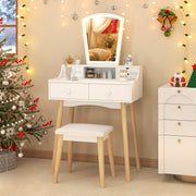 The LED lighted mirror has 3 lighting modes and adjustable brightness to provide optimal illumination for makeup application. The vanity set also comes with a soft cushioned stool to make your makeup time enjoyable. 1 open shelf and 6 drawers keep your items neatly organized. Supported by pine wood legs, the table and chair remain stable on the ground. Additionally, the anti-slip foot pads and anti-toppling design are included for enhanced steadiness and safety. Bullet Point: 3-Color Adjustable Lights: The vanity table features a clear mirror with LED light strip. The light strip has 3 color settings (warm yellow/warm white/cold white) and adjustable brightness. There is a touch switch for you to customize the light color and brightness. Sufficient Storage Space: 1 open shelf, 2 large drawers, and 4 small drawers offer ample space for your jewelries, nail polishes, cosmetics, or skin care products. You can also place sundries on the spacious tabletop to keep them within reach. Sturdy and Reliable Structure: The solid pine wood legs ensure strong and stable support. The anti-slip foot pads enhance overall steadiness. More importantly, anti-toppling design prevents tipping over and ensures extra stability. Cushioned Stool for Coziness: The matching stool is equipped with a soft padded seat for a comfy sitting experience. You won’t feel uncomfortable during your makeup time even after sitting for a long period of time. When not in use, the stool can be stored under the tabletop to save space. More Considerate Features: Smooth cut-out handles help you conveniently open the small drawers for easy reach. Moreover, the easy-to-clean surface also makes maintenance a breeze.