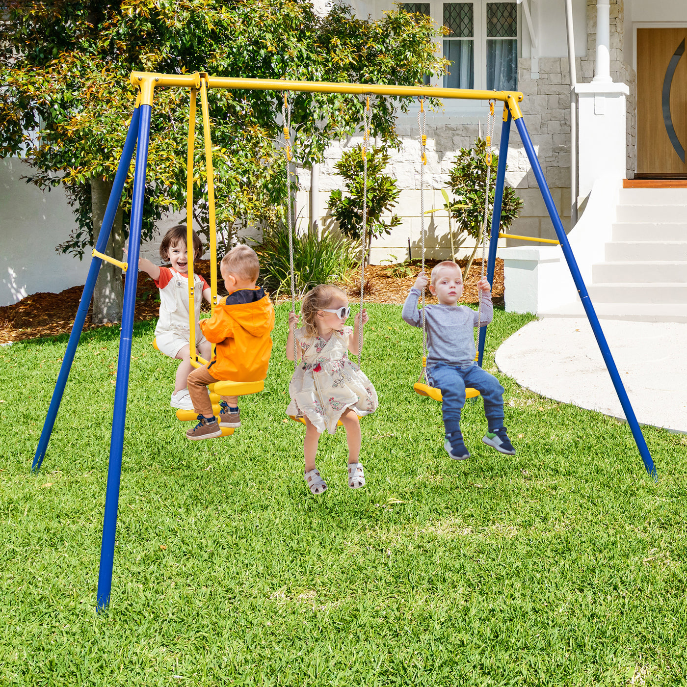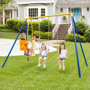 Turn your backyard into a fun playground with this metal swing set! Including 2 swings and 1 glider, this heavy-duty swing set provides multiple kids with hours of fun. The A-shaped frame, made with sturdy metal, ensures the overall steadiness. Safety is never to be ignored with the equipped ground stakes. Moreover, the swings feature adjustable ropes for optimal comfort. And the cozy glider seats with footrests allow for interactive play for 2 kids. This heavy-duty playset is an ideal gift for children aged 3-12 years old, which is beneficial to the development of motor skills, coordination, confidence, and social skills. Bullet Points: 4 Fun Seats Included: This heavy-duty swing set features 2 swing seats and 2 glider seats that offer kids versatile play options. Besides, it can accommodate multiple children at once, promoting social interaction and teamwork skills. Heavy-duty Construction: Crafted from heavy-duty metal, the A-shaped frame is reliable for years to come and provides a safe play area for your kids to enjoy. Moreover, the sturdy metal plates and reinforced cross bar increase the overall stability. And the extra ground stakes make the swing playset more stable. Comfy and Adjustable Swings: The multi-strand ropes of the swings are adjustable to suit your child’s heights and ages for optimal comfort. The adjustable range from the ground to the swing seat is 35-80 cm. Attached to the swing stand with solid carabiners, the swings ensure children’s safety during playtime. Cozy and Interactive Glider: Equipped with comfortable seats, the glider of this metal swing set allows 2 kids to play together. More importantly, there are considerate footrests for upgraded coziness. Ideal Gift for Little Ones: As a perfect gift for children between the ages of 3 and 12, this heavy-duty playset keeps kids active and engaged in outdoor play.