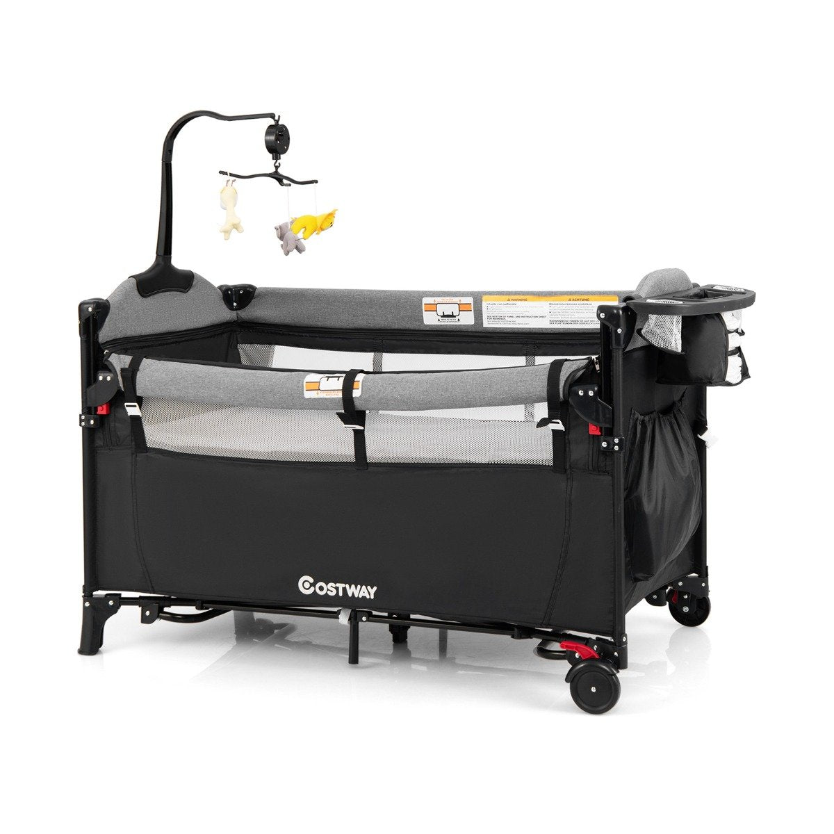 This 5-in-1 baby bassinet with a removable mattress, a diaper table and a zippered door meets all your baby's needs, from sleep, diaper changes to play. It is suitable for a baby aged 0-3 years. The bedside sleeper mode with a 4-level height adjustable side armrest makes it fit most adult beds, keeping your baby at an arm’s reach for easy feeding throughout the night. The cradle mode is helpful to lull the baby into a peaceful sleep. Moreover, the side storage basket, which can be mounted in different places on the crib rails based on your need, keeps everything organized. The lockable wheels make it easy to move around. In addition, this baby bassinet is ideal for travel with the foldable design and a convenient carry bag. Please note: the rocking bar must be removed first before folding the bed. 5-in-1 Multipurpose Design: This all-in-one nursery solution can serve as a baby bedside sleeper, rocking bassinet, baby crib, changing table and baby playpen, which meets different needs of babies aged 0-36 months. The zippered door designed adds fun for the babies to crawl in and out. Moreover, the crib complies with EN71 certification for reliable use. Adjustable Height and Secure Fixation: One side armrest of this baby bedside sleeper features 4-level adjustable height (77.5 cm/72.5 cm/67.5 cm/62.5 cm), making it the fits various adults' beds. You can press the button to adjust to your desired height and poll up fabric and bind it with the buckled strap. In addition, with the included fixing belt, the crib can be securely attached next to parent's bed. Enhanced Comfort for Baby: This infant bassinet comes with a soft mattress and breathable mesh sides for sweet dreams and peaceful sleep. The gentle rocking function and included music box can soothe the baby and let the baby fall asleep quickly. Plus, 3 cute animal dolls not only promote the baby's visual development, but also improve the baby's ability to grasp. Excellent Mobility, Stability and Portability: This baby bedside crib is equipped with 2 lockable wheels and 7-point supporting structure, perfectly combing flexible movement with stability. Moreover, the crib can be easily folded and stored in the included carry bag. Please note: the rocker must be removed first before folding the bed. Handy Storage and Easy Maintenance: This portable pack and play features a large storage basket to keep all your baby essentials at hand while maintaining an organized space. The basket can be installed on the crib rail as appropriate. Moreover, the U-shaped changing table is detachable and easy to clean.
