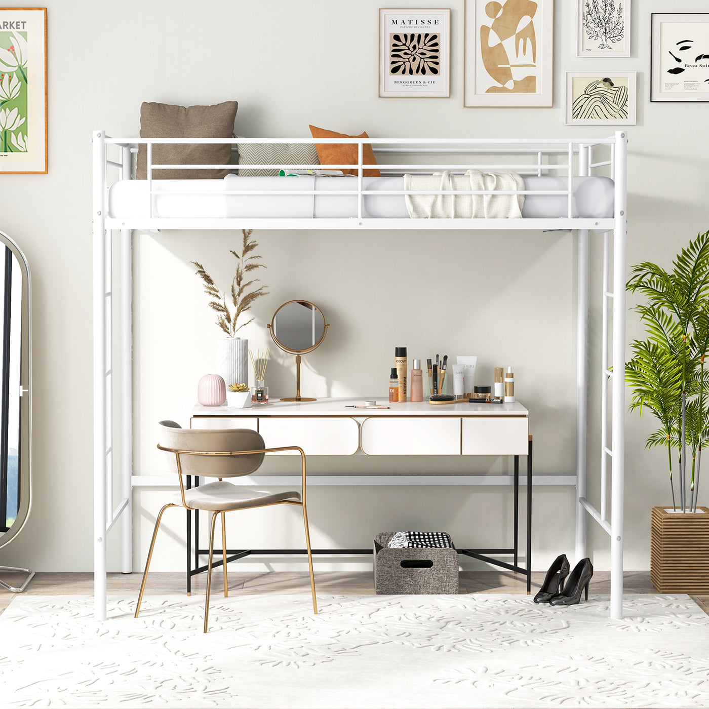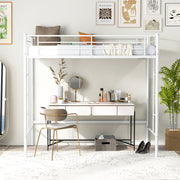 Metal Space-saving Loft Bed Frame with Full-length Safety Guardrail-White