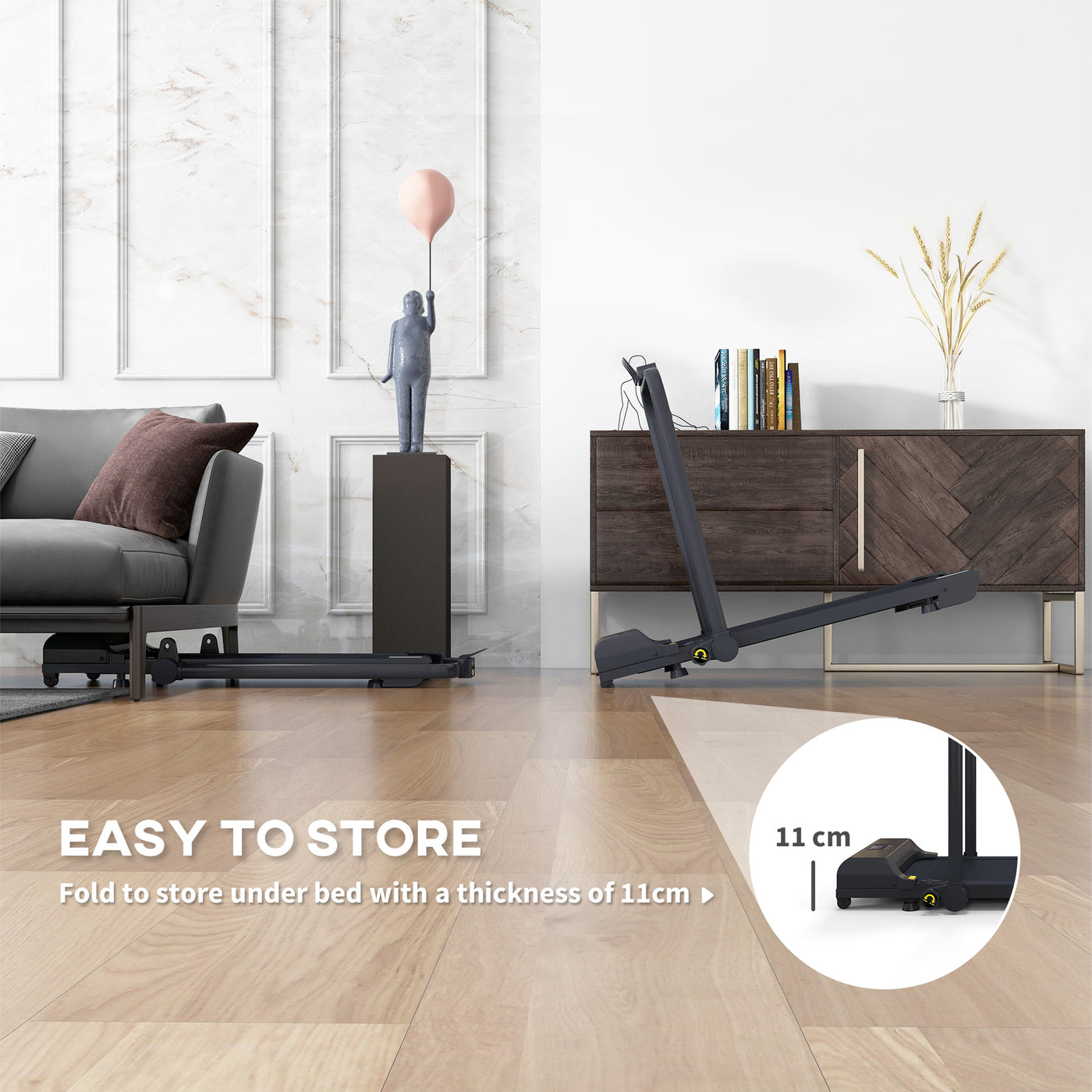 Get fit with the versatile HOMCOM treadmill, designed for running and walking. Keep the handle upright for running mode (1-10km/h), then fold it down for walking mode (up to 6km/h) and use it under a table or desk. The LED screen shows time, speed, distance and calories burnt to help you track your goals. Compact and smooth, transform any corner of your home into a mini fitness centre, with minimum noise!