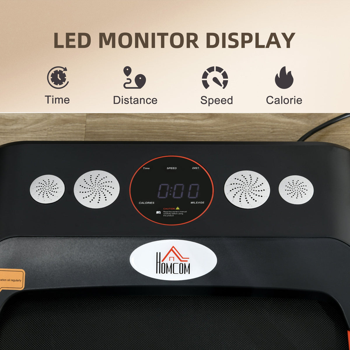 Boost your step count without leaving home with the HOMCOM walking treadmill. The built-in LED screen helps you monitor time, speed, distance and calories, keeping you on track with your fitness goals. It features a non-slip running belt for safety and a safety key that allows for quick stops if necessary. With two wheels at the bottom, it's easily portable, making it convenient to move wherever you need. Enjoy an effective and safe workout right from the comfort of your own home!