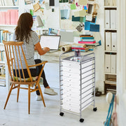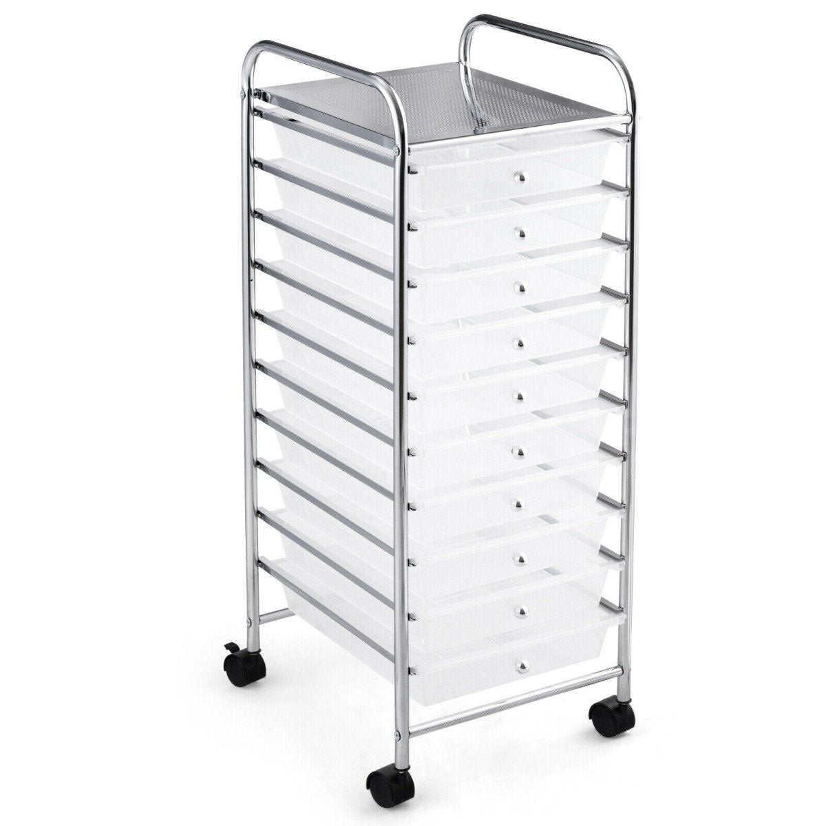 Are you looking for a portable storage cart that is equally good looking as well? This 10-drawer storage cart delivers all your requirements. It’s sturdy enough and works best to store papers, tools, accessories and a lot more other daily life items that can easily create a mess at your home. The cart is lightweight and easily movable. Take control over clutter and add a vibrant splash of colour with this mobile storage trolley, do not hesitate to place an order! Sufficient Storage Space: The rolling storage cart consists of 10 drawers, which provide ample storage space for your various items to keep them organized as well. Moreover, different coloured drawers come in handy to classify the placement of your items. Flexibility and Mobility: 4 universal wheels swivel 360 degrees for ease in moving it around. Besides, the assembly process is easier with essential accessories and detailed manual provided. Meanwhile, 2 of the wheels are equipped with brakes to keep them stable and stationary. More Intimate Details: Each drawer of this trolley cart has a round handle, which is greatly convenient for the opening and closing of the drawer, and the smooth slide rail of the drawer is equipped with interlock system, which can lock the drawer well and prevent it from falling. Versatile Function: The multifunctional 10-drawer storage shelf provides a lot of organiser space and can be used in office, home, living room, entryway, bathroom, school, garage and more. All it does is play a practical role in organized and neat storage.\ Solid and Durable Construction: The main frame of this drawer storage cart is constructed of premium iron material coated with chrome, which brings a firm frame and gives you a long time service. This 10-drawer rolling cart is designed to be service durable and is resilient to deformation.