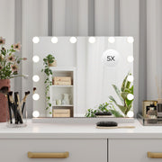 Elevate your vanity space with this vanity mirror with lights! This Hollywood vanity mirror with lights is a must-have for any makeup lover. The 14 LED bulbs provide excellent illumination, and the 5X magnifier is incredibly useful for precise application, like eyebrow, eye shadow, eyeliner, lipstick, etc. Besides, you can tailor your makeup application to any occasion with 3 color lighting modes and adjustable brightness. Each setting is designed to simulate different environments, ensuring you look your best in any light. The touch-sensitive switches allow for a seamless transition between modes and brightness levels. The mirror can be placed atop any vanity table or dresser. The sleek and modern design also makes it a chic accessory to your bedroom decor. Adjustable LED Lights: This vanity mirror features 14 dimmable LED light bulbs, which is perfect for makeup application and grooming. The adjustable brightness and 3 color temperatures (cool light 6500K, natural light 4000K and warm light 3000K) ensure you have the perfect illumination for precision. Smart Touch Control: This Hollywood makeup mirror is designed with 3 intelligent touch keys for easy operation. You can touch the middle key to turn on/off the light, long press the 'P' button to adjust light brightness and just touch the 'M' button to switch the light color. HD Mirror with 5X Magnifier: The 4mm copper-free silver mirror provides clear reflection without distortion. In addition, this lighted vanity mirror comes with a detachable 5X magnify mirror, allowing you to see your face clearly for flawless makeup. Well-made Details: The sturdy metal frame offers great protection and ensures long-lasting use. The large base makes the vanity mirror firmly stand on your dressing table. Moreover, the inclusion of a complimentary mirror cloth allows for easy maintenance, keeping your reflection spotless. Perfect Size and Stylish Design: This vanity mirror with lights measures 20" x 5" x 17" (L x W x H), which is perfectly sized for tabletop use. Additionally, the elegant design of this Hollywood makeup mirror makes it a perfect addition to any bedroom, salon, makeup studio, etc.