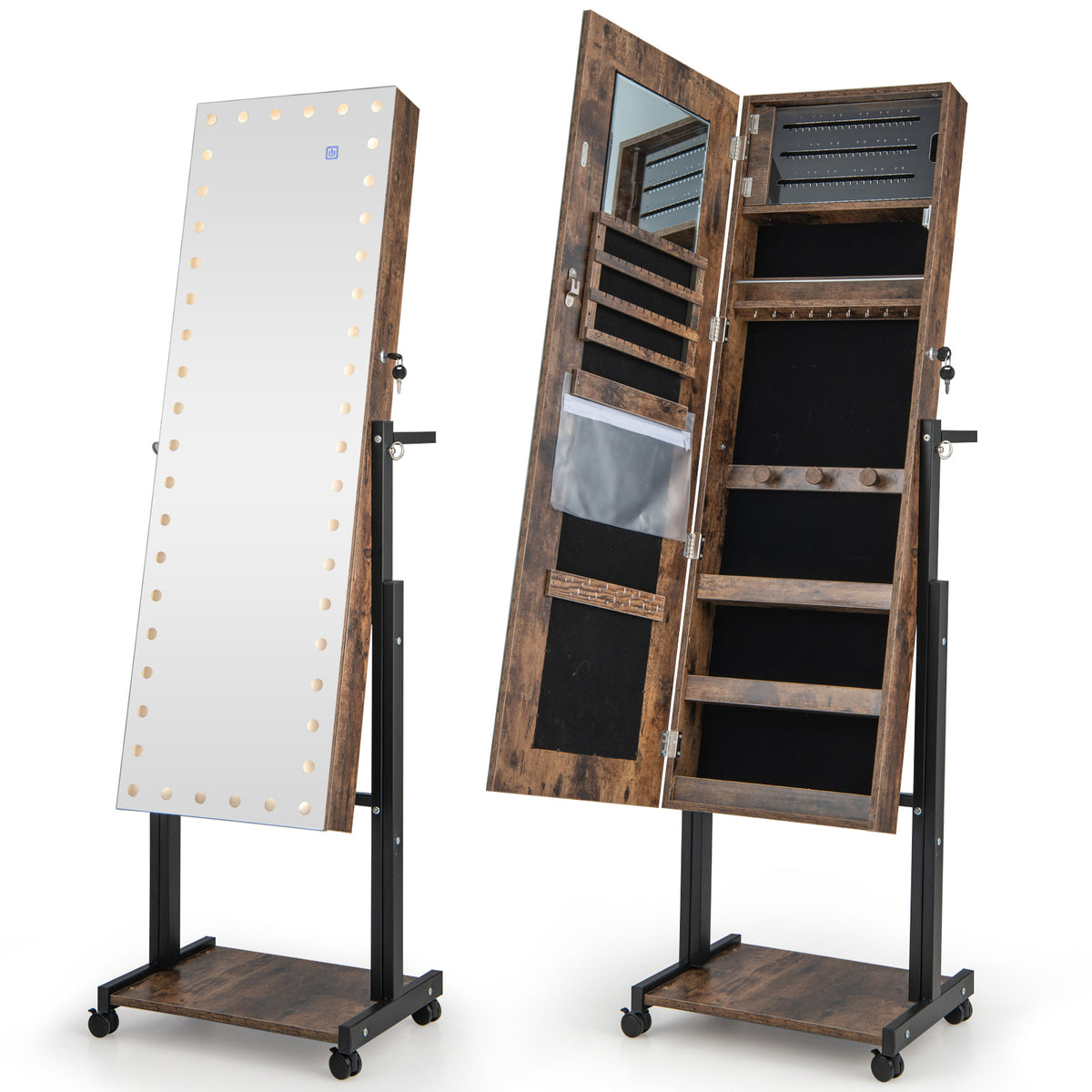 Crafted with top-notch materials, this jewelry cabinet features a stunning full-length mirror with built-in 3-color LED lights. Choose between warm yellow, cool white, or natural lighting to create the perfect ambiance for your outfits. The adjustable heights and tilt angles ensure a personalized and comfortable viewing experience for users of all heights. With its spacious interior and well-organized compartments, this cabinet offers ample storage for your entire jewelry collection. Elevate your jewelry storage and enhance your daily routine with our exceptional standing jewelry cabinet. If you are looking for a jewelry cabinet like this, do not hesitate to place an order! Romantic LED Lighted Full-Length Mirror: Designed with built-in dot LED lights, this framesless full-length mirror creates a beautiful lighting ambient. And the lights have 3 color modes (warm yellow, natural, cool white) and adjustable brightness. The operation is simple through the touch switch. 120 x 37cm Large Storage Capacity: This standing jewelry cabinet features 105 earring slots, 56 earring stud holes, 3 bracelet rods, 1 zippered storage bag, 21 necklace hooks, 84 ring slots, 4 storage shelves and 1 open storage shelf for all your collections, including jewelry, cosmetics and other accessories. Adjustable Height and Angle: This jewelry organizer is available in 3 heights from 155 to 175cm for users of different heights. Moreover, the full-length mirror can be adjusted in 2 tilt angles, offering an optimal angle to show a head-to-toe view of your outfits. Worth-Mentioning Features: The earring holder frame inside the cabinet can swing out and is more convenient for you to manage the earrings. The soft-lined storage space prevents scratching jewelry. And the lockable door with keys enhances security. Stable Metal Stand with Casters: The metal legs are more durable than wooden stands, which has better load-bearing capacity and durability. Equipped with 4 lockable universal wheels, this jewelry armoire is effortless to move around.