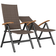 Outsunny 2 Pieces Folding Rattan Garden Dining Chairs with 5-level Reclining High Back, Wood Armrests for Outdoor - Brown - Brown
