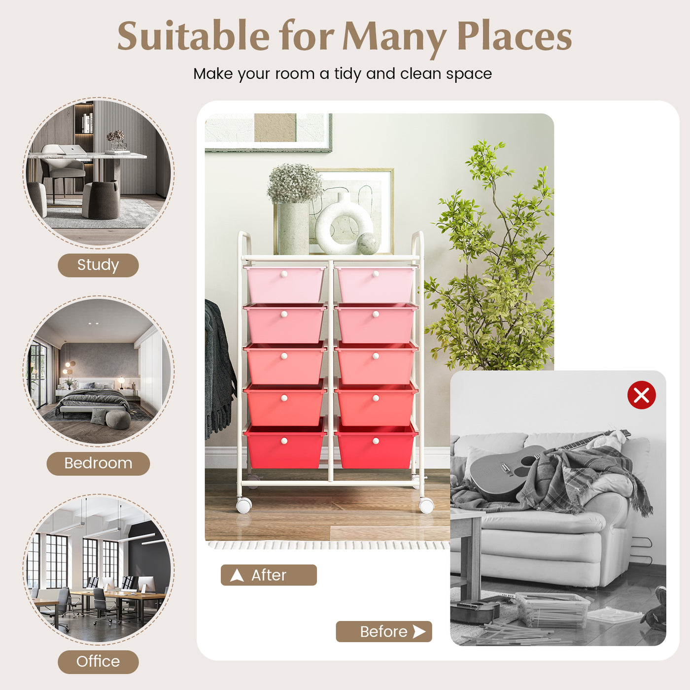 Whether you're a teacher looking for a way to store and organize classroom supplies, an office worker in need of extra storage for paperwork or a homeowner wanting to declutter your space, the 10-drawer rolling storage cart is a practical and stylish solution!This utility cart features 1 mesh top platform and 10 spacious drawers, allowing you to store and organize a variety of items such as tools, scrapbook paper, office supplies, or craft materials. And The drawers are also removable, making it convenient to take them out and organize your supplies even more efficiently. If you want to move it, just grab the metal handles and push it through 4 universal wheels. If you are looking for a storage cart like this, do not hesitate to place an order! Ample Storage Space: With 1 large top platform (58.5 cm x 37 cm) and 10 practical drawers (34 cm x 26 cm x 12 cm ), this rolling storage cart provides you with roomy space to store different items. Lockable Wheels: This movable organizer features 4 universal wheels, which allow you to move it freely. And 2 wheels are equipped with brakes for better manoeuvrability and stability. Functional Drawers: All the drawers are removable that allow you to use them as single storage boxes for educational or recreational purposes. And the drawers come with convenient knobs for easy pulling out. Multipurpose Cart: Based on your different storage needs, this movable utility cart can be used in different places, such as classroom, kids room, office, studio and more, keeping the space tidy and clean. Strong Stability: Constructed of the sturdy metal frame, this mobile rolling cart is stable enough to support various items steadily. Besides, the assembly is quite simple for great convenience.