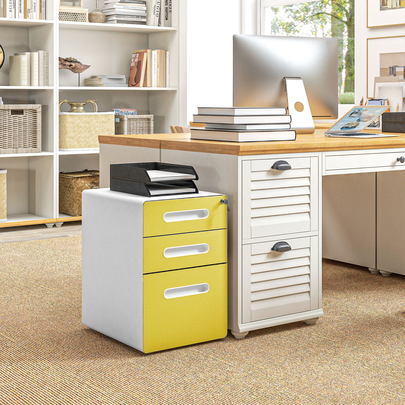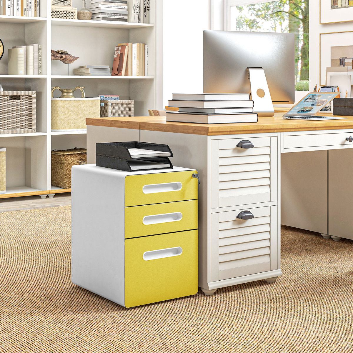 Vinsetto 3 Drawer Filing Cabinet, Steel Lockable File Cabinet with Lock and Wheels, for A4, Letter, Legal Sized Files, Yellow - Yellow