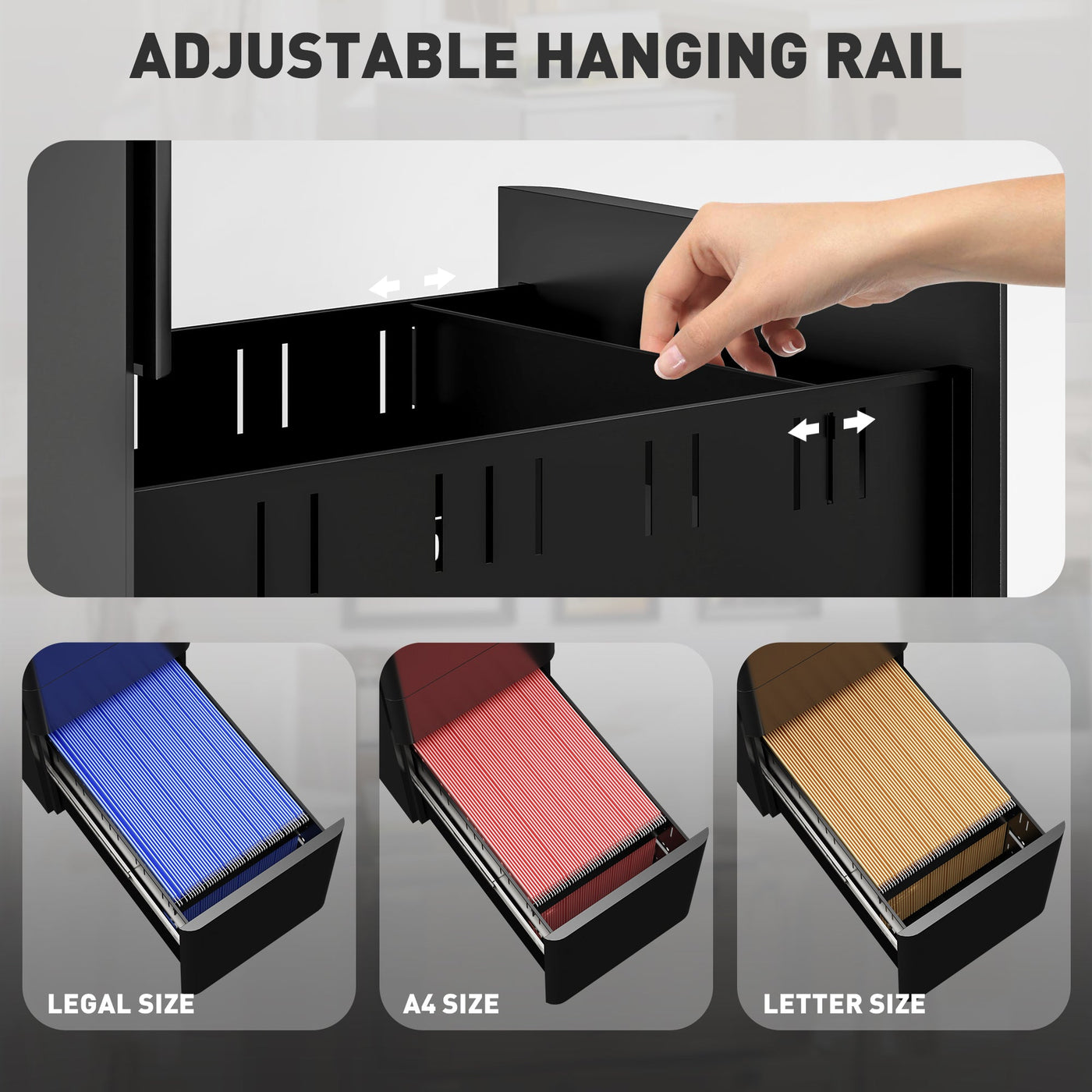Maximise your space with the three drawer filing cabinet from Vinsetto that offers spacious storage and a top surface, doubling as a printer stand. Enjoy organised ease with adjustable hanging rail for three different file sizes and a lock to secure your important essentials. What's more, the Vinsetto lockable drawers with compact design fits neatly anywhere and rounded corners prevent accidental bumps, making it a great office ally.
